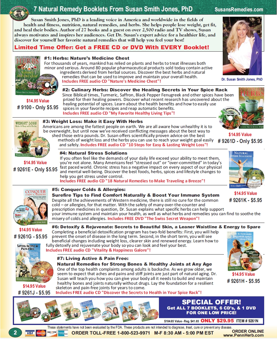 So don’t put it off any longer. Make your health a top priority in your life. When you visit SusansRemedies.com, you will learn more about my interest in natural living and the special herbal packages that I created for the Penn Herb Company, incorporating all the most common conditions and ailments most of us deal with (for men, women and children).